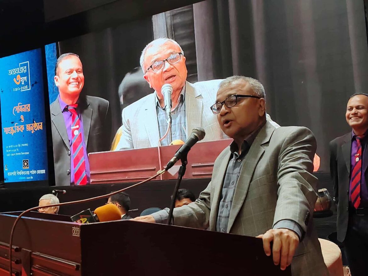 আজ শুক্রবার (১৮ জুলাই) সন্ধ্যায় রাজশাহী বিশ্ববিদ্যালয়ের কাজী নজরুল ইসলাম মিলনায়তনে আয়োজিত ‘নতুন বাংলাদেশ বিনির্মাণ: কোন পথে?’ শীর্ষক সেমিনারে এ মন্তব্য করেন তিনি। রাজশাহী বিশ্ববিদ্যালয় পাঠক ফোরামের তিন যুগপূর্তি উপলক্ষে এই সেমিনারের আয়োজন করা হয়।