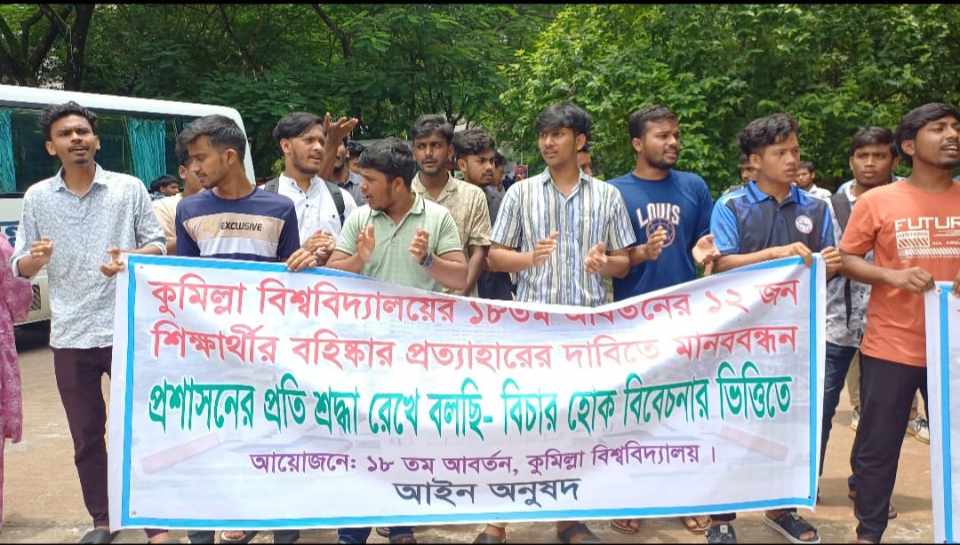 র্যাগিংয়ের দায়ে কুমিল্লা বিশ্ববিদ্যালয়ের (কুবি) ১৮ তম আবর্তনের ১২ জন শিক্ষার্থীর বহিষ্কার প্রত্যাহারের দাবিতে বিভিন্ন অনুষদের শিক্ষার্থীদের ব্যানারে মানববন্ধন করেছেন ১৮ তম আবর্তনের একদল শিক্ষার্থী।