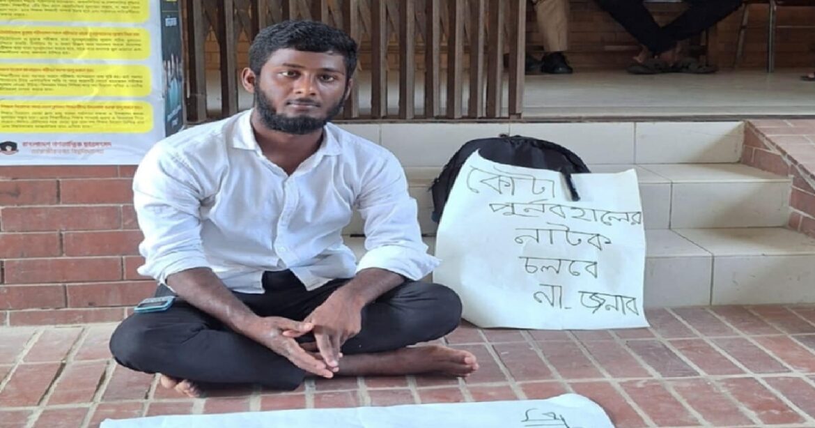 সরেজমিনে গিয়ে দেখা যায়, রেজিস্ট্রার বিল্ডিংয়ের নিচে এক শিক্ষার্থী অনশনে বসেছেন। তার পাশে একটি প্ল্যাকার্ডে লেখা, “কোটা পুনর্বহালের নাটক চলবে না, জনাব”