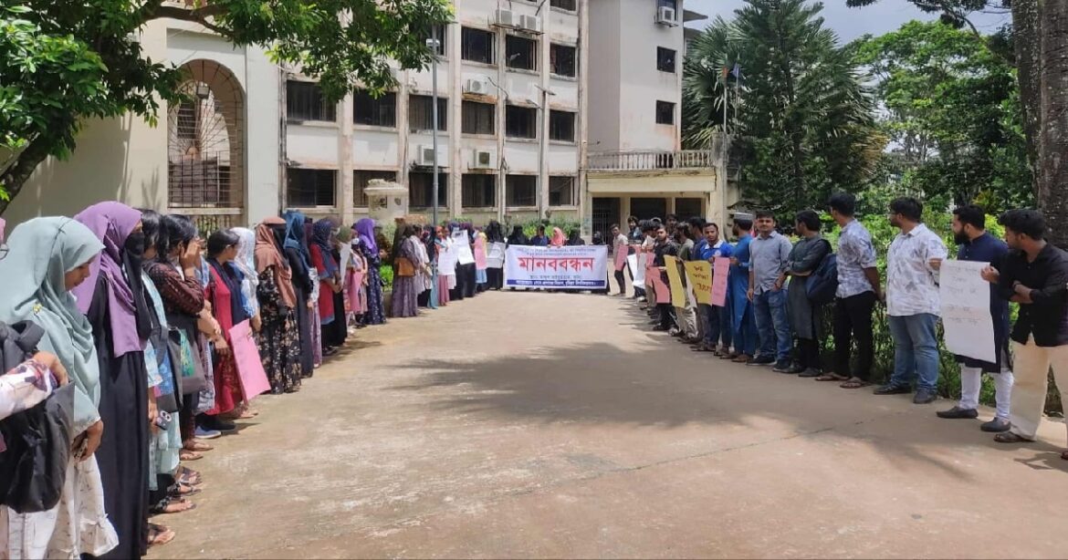 মঙ্গলবার (১৯ আগস্ট) সকাল ১১টার দিকে বিশ্ববিদ্যালয়ের গোল চত্বরে এই মানববন্ধন করেন শিক্ষার্থীরা।