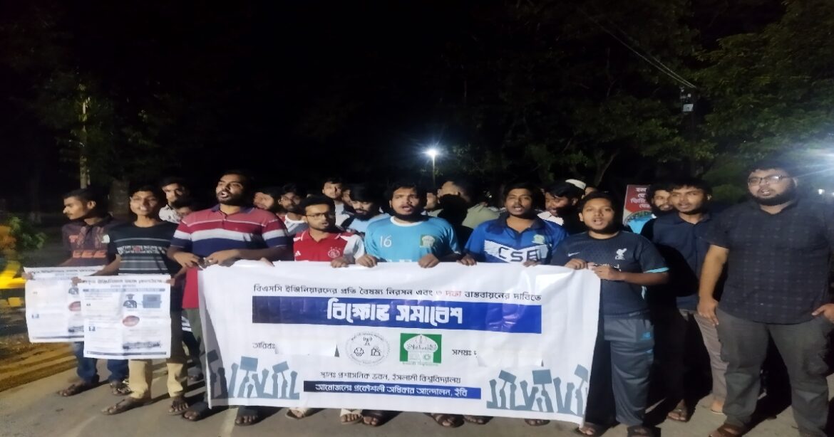 প্রকৌশল শিক্ষার্থীদের ওপর সাউন্ড গ্রেনেড ব্যবহার করে ন্যাক্কারজনকভাবে হামলার প্রতিবাদে ইসলামী বিশ্ববিদ্যালয়ে বিক্ষোভ মিছিল অনুষ্ঠিত হয়েছে।