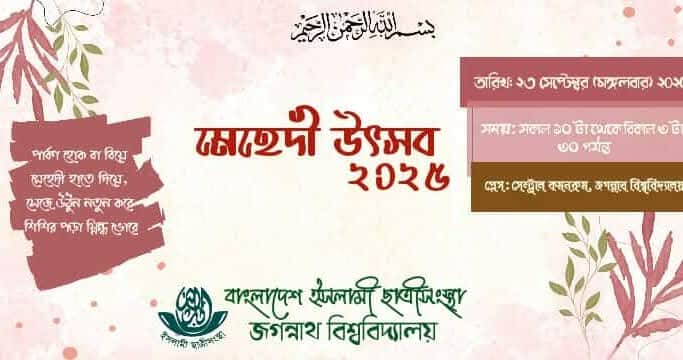 সুস্থ সাংস্কৃতিক পরিবেশ গড়তে জগন্নাথ বিশ্ববিদ্যালয় (জবি) শাখা বাংলাদেশ ইসলামী ছাত্রীসংস্থার উদ্যোগে প্রথমবারের মত অনুষ্ঠিত হতে যাচ্ছে দিনব্যাপী ‘মেহেদী উৎসব’।