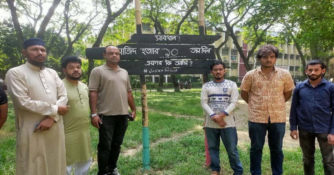 সরজমিনে দেখা যাওয়া সাইনবোর্ডে বড় অক্ষরে লেখা আছে, “সাবধান! সাজিদ হত্যার___তম দিন, এরপর কি আমি?” এবং নিচে হ্যাশট্যাগে লেখা হয়েছে, “জাস্টিস ফর সাজিদ”।