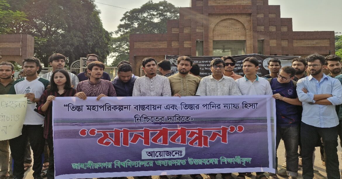 তিস্তা মহাপরিকল্পনা বাস্তবায়ন এবং তিস্তার পানির ন্যায্য হিস্যা নিশ্চিতের দাবিতে প্রতিবাদ সমাবেশ ও মানববন্ধন করেছে জাহাঙ্গীরনগর বিশ্ববিদ্যালয়ের শিক্ষার্থীরা।
