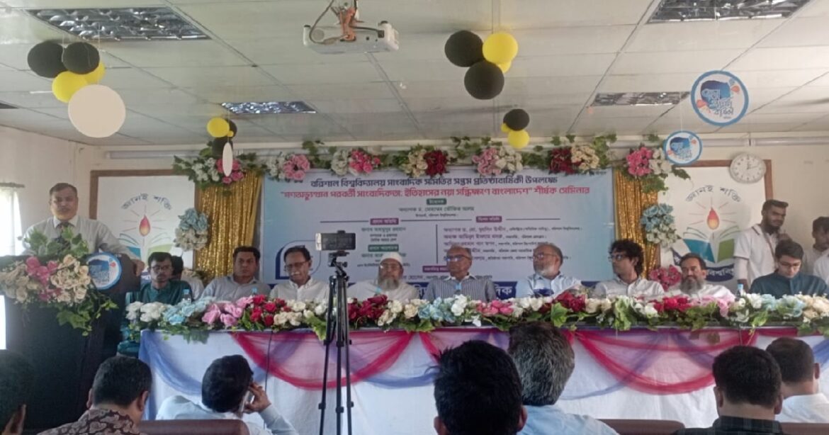 বরিশাল বিশ্ববিদ্যালয় সাংবাদিক সমিতির (ববিসাস) সপ্তম প্রতিষ্ঠাবার্ষিকী উপলক্ষে ‘জুলাই গণঅভ্যুত্থান পরবর্তী সাংবাদিকতা: ইতিহাসের নয়া সন্ধিক্ষণে বাংলাদেশ’ শীর্ষক আলোচনা সভা অনুষ্ঠিত হয়েছে।