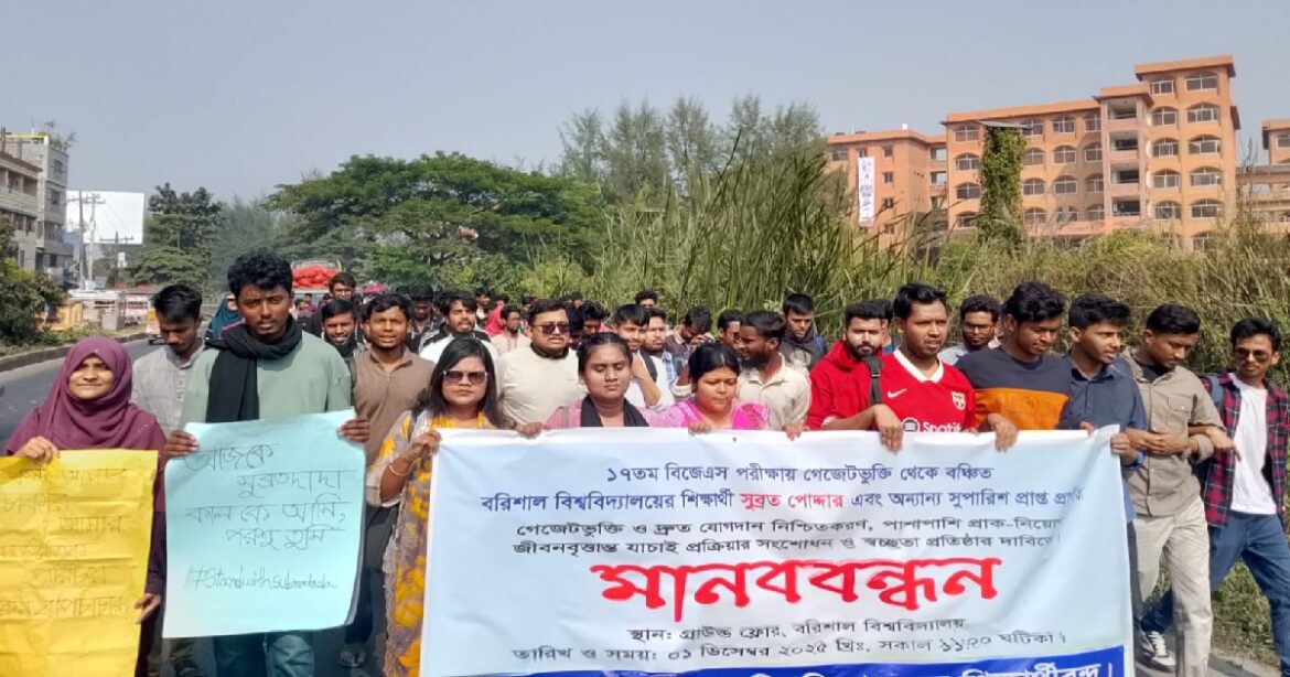১৭ তম বাংলাদেশ জুডিশিয়াল সার্ভিস (বিজেএস) গেজেট থেকে বাদ পড়া বরিশাল বিশ্ববিদ্যালয়ের (ববি) শিক্ষার্থী সুব্রত পোদ্দারসহ ১৩ জনকে অন্তর্ভুক্তির দাবি জানিয়েছে শিক্ষার্থীরা।