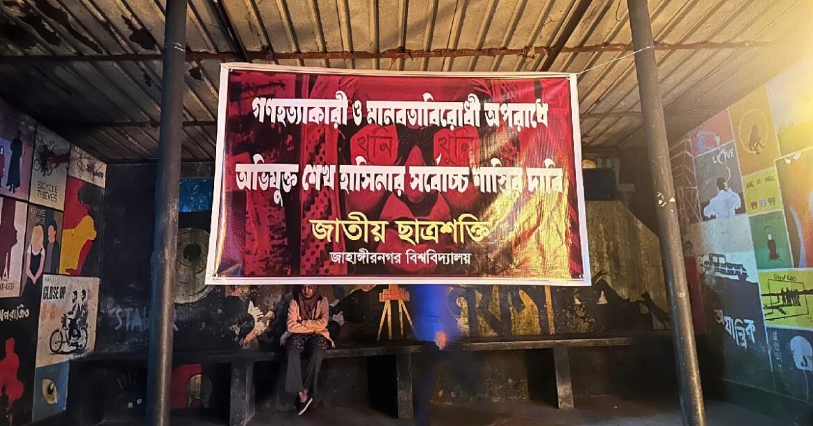 স্বৈরাচার শেখ হাসিনার সর্বোচ্চ বিচার দাবি করে একটি ব্যানার টাঙিয়ে ছিল জাতীয় ছাত্রশক্তি জাহাঙ্গীরনগর বিশ্ববিদ্যালয় শাখার নেতা-কর্মীরা। তবে ওই ব্যানার কে বা কারা খুলে ফেলেছে বলে অভিযোগ উঠেছে।