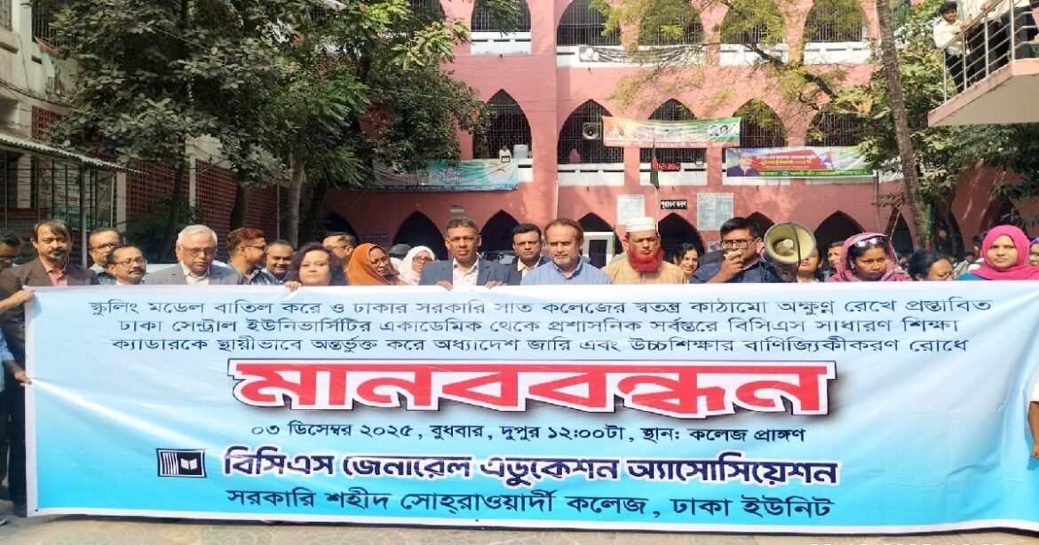 সাত কলেজের স্বাভাবিক শিক্ষার পরিবেশ পুনরুদ্ধার ও প্রস্তাবিত স্কুলিং পদ্ধতি বাতিলের দাবিকে মানববন্ধন ও সংবাদ সম্মেলন করেছে সরকারি শহীদ সোহরাওয়ার্দী কলেজের শিক্ষকরা।