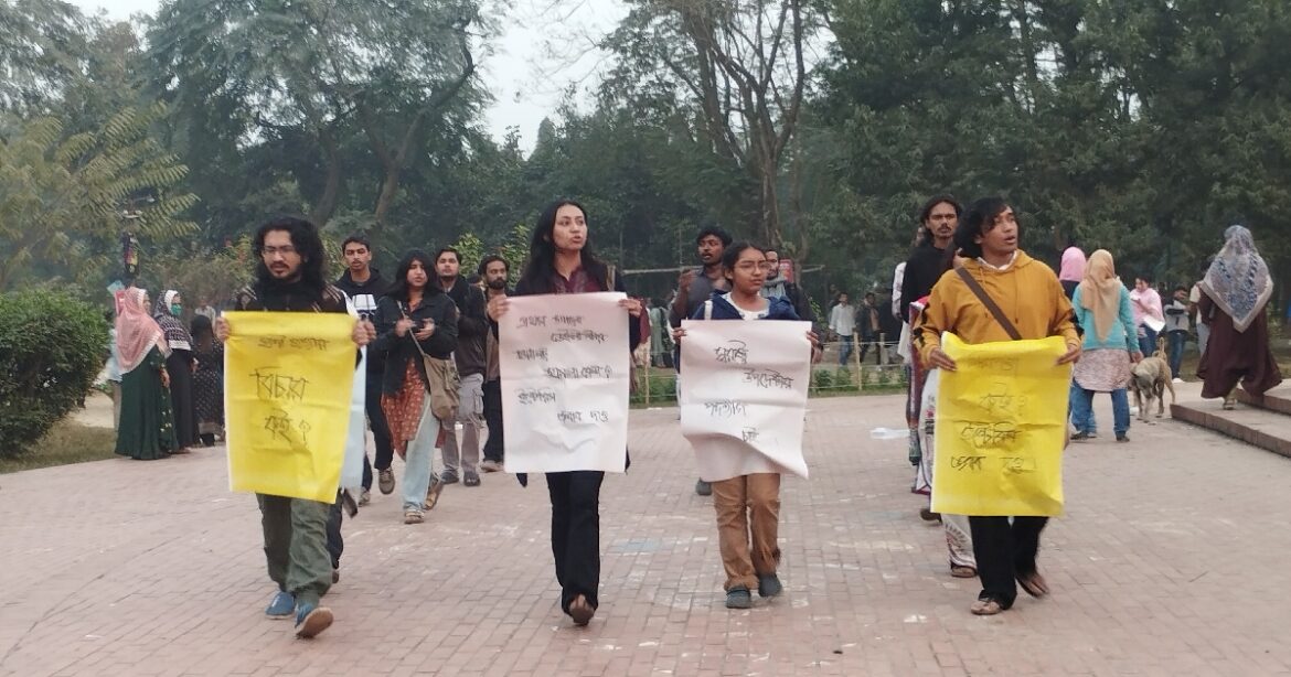 আজ শুক্রবার বিকেলে সোয়া পাঁচটার দিকে নিপীড়নের বিরুদ্ধে জাহাঙ্গীরনগর ব্যানারে বিশ্ববিদ্যালয়ের মুরাদ চত্ত্বর এলাকা থেকে বিক্ষোভ মিছিল বের করেন তারা। মিছিলটি কয়েকটি সড়ক ঘুরে শহীদ মিনারের পাদদেশে গিয়ে শেষ হয়। পরে সেখানে সমাবেশ করেন তারা।