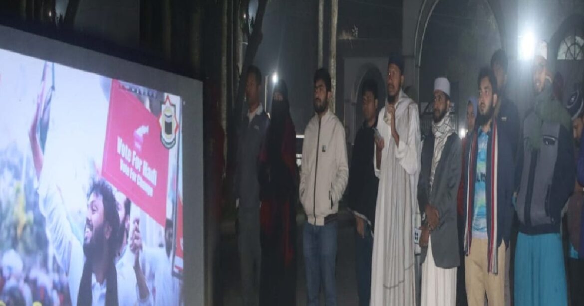 এসময় সংগঠনটির সভাপতি ইসমাইল হোসেন রাহাত বলেন, আজ আমরা শহিদ শরীফ ওসমান হাদির সেরা উক্তি, টকশো এবং তার বক্তব্যগুলো ডকুমেন্টারি আকারে প্রদর্শন করার ব্যবস্থা করেছি। যেই হাদি বাংলাদেশকে চেইঞ্জ করতে চেয়েছিলেন, কালচারাল ফ্যাসিস্টদের বিরুদ্ধে লড়ে গিয়েছিলেন, সেই হাদি যেন হারিয়ে না যায়, সে যেন আমাদের মধ্যে জীবিত থাকে সেটাই আমরা আজ উপস্থাপন করতে চেয়েছি। জুলাই এবং দেশ মাতৃকার জন্য যিনি লড়ে গিয়েছেন সেই হাদিকে যেন আমরা সর্বত্র অনুসরণ করি সেটা জানান দিতেই আমাদের এ আয়োজন।
