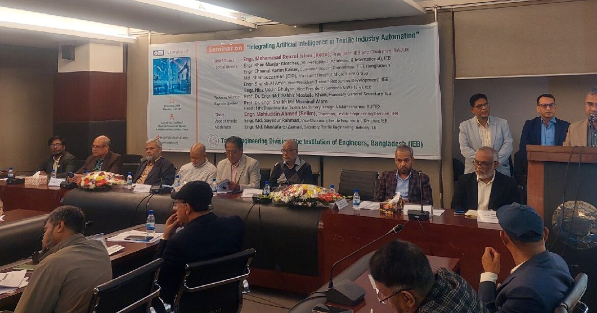 বাংলাদেশের টেক্সটাইল শিল্পে আধুনিক প্রযুক্তির সমন্বয় এবং অটোমেশনে কৃত্রিম বুদ্ধিমত্তার (এআই) ভূমিকা ও সম্ভাবনা নিয়ে দ্য ইনস্টিটিউশন অব ইঞ্জিনিয়ার্স বাংলাদেশ (আইইবি)-এর টেক্সটাইল ইঞ্জিনিয়ারিং বিভাগের উদ্যোগে সেমিনার অনুষ্ঠিত হয়েছে।