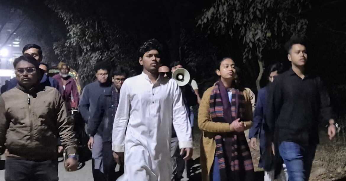 শুক্রবার (৬ ফেব্রুয়ারি) রাতে বিশ্ববিদ্যালয়ের বটতলা থেকে বিক্ষোভ মিছিল শুরু হয়ে বিভিন্ন সড়ক প্রদক্ষিণ করে অদম্য চব্বিশের সামনে এসে শেষ হয়।