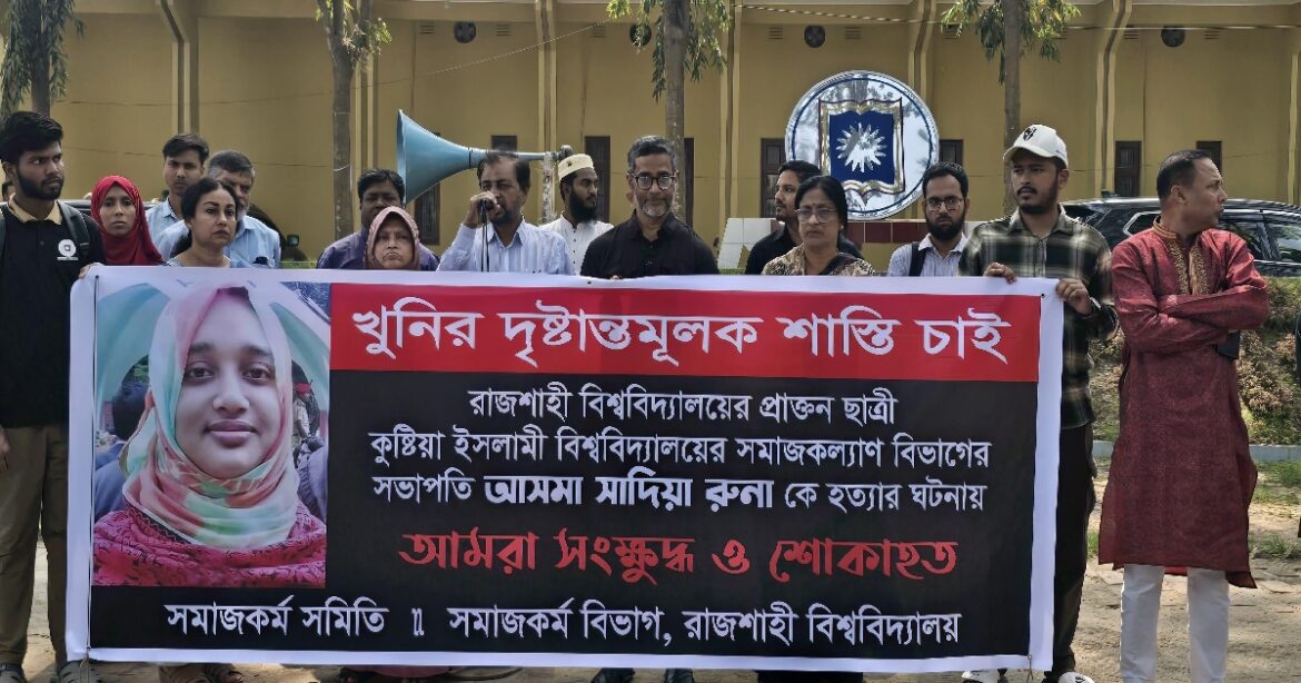 ইসলামি বিশ্ববিদ্যালয়ের সহযোগী অধ্যাপক আসমা সাদিয়া রুনাকে নিজ কর্মস্থলে গলা কেটে হত্যার ঘটনায় বিচারের দাবিতে রাজশাহী বিশ্ববিদ্যালয়ে (রাবি) মানবন্ধন কর্মসূচি পালন করা হয়েছে। কর্মসূচিতে হত্যাকারীর বিচারসহ ৩ টি দাবি জানানো হয়। আজ বৃহস্পতিবার (৫ মার্চ) দুপুরে বিশ্ববিদ্যালয়ের সিনেট ভবনের সামনে সমাজকর্ম বিভাগের শিক্ষক-শিক্ষার্থীরা এ দাবি জানায়।