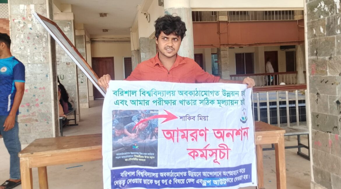 বরিশাল বিশ্ববিদ্যালয়ের (ববি) এক শিক্ষার্থী দ্বিতীয় বর্ষে পাঁচ বিষয়ে অকৃতকার্য হয়ে পরীক্ষার উত্তরপত্রের সঠিক মূল্যায়ন চেয়ে আমরণ অনশন শুরু করেছেন।
